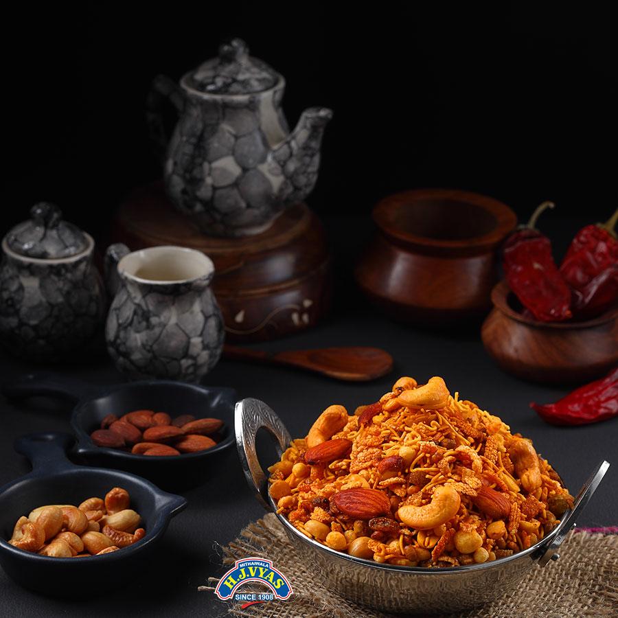 It matches the Jamnagri bandhani in popularity! All food lovers are bound to enjoy this variety. The best quality of pulses, selected dry fruits & specially prepared masala (A concoction of select spices) make this a highly relish able variety. Prepared using the minimum amount of salt, and fresh peanut oil, & dripped through the centrifuge system. It maintains the same taste & freshness for 45 days!