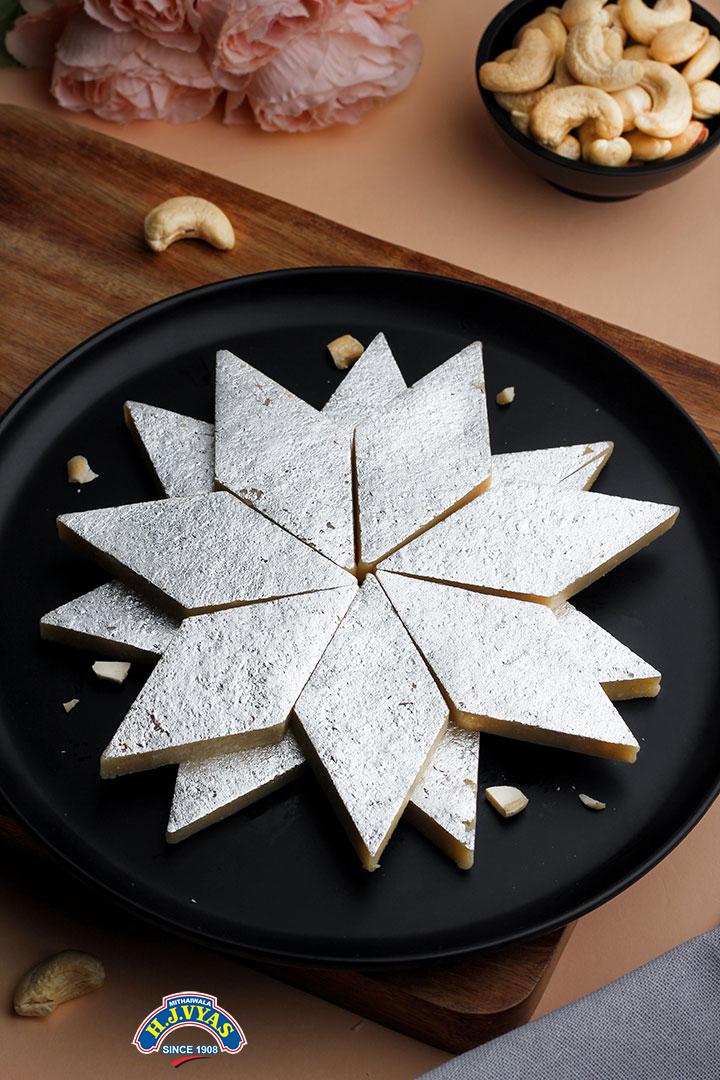 Kaju (Cashew) nut katri is a soft sweet. Prepared by standard kaju roll with pharma grade law sugar, and dressed with a vegetarian silvery coating(Varakh), 12 days shelf life.