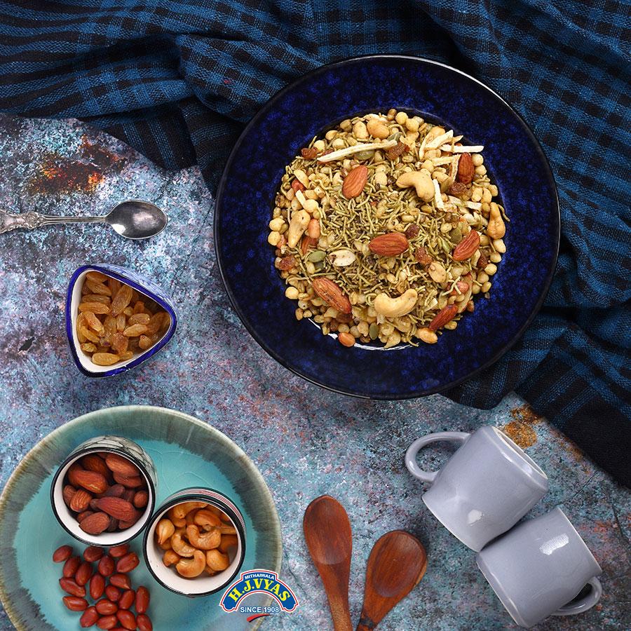 Gram flour, Mung, Peanuts, Almond, Cashew, Raisins, Watermelon seeds, Veg. oil, Salt, Dried potatoes, Chilli powder, Dried mango powder, Black salt.