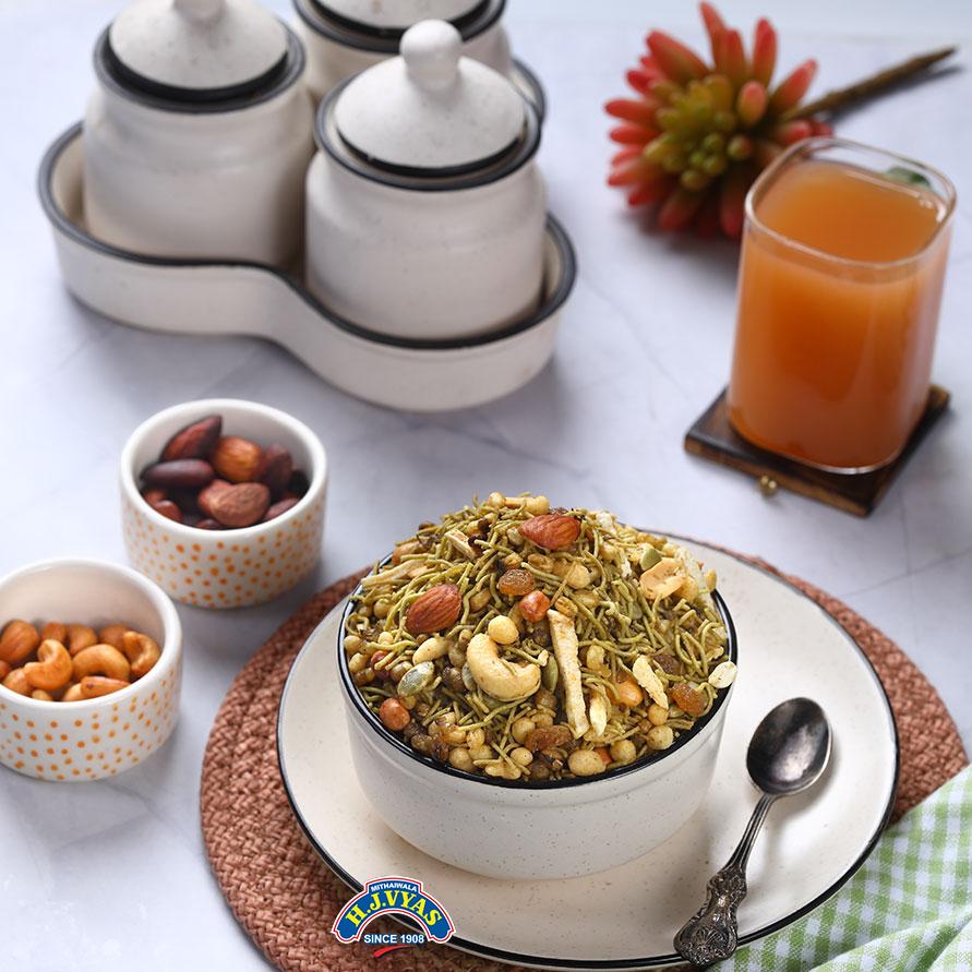 High-quality mung beans are mixed with spinach sev. No artificial colors or chemicals are added. Fried in fresh peanut oil, with a minimum amount of salt & dripped through the centrifuge system. You can relish the same taste & freshness for 45 days!