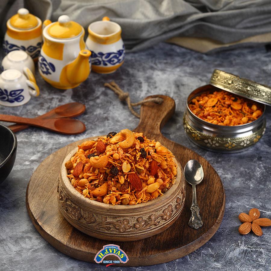It matches the Jamnagri bandhani in popularity! All food lovers are bound to enjoy this variety. The best quality of pulses, selected dry fruits & specially prepared masala (A concoction of select spices) make this a highly relish able variety. Prepared using the minimum amount of salt, and fresh peanut oil, & dripped through the centrifuge system. It maintains the same taste & freshness for 45 days!