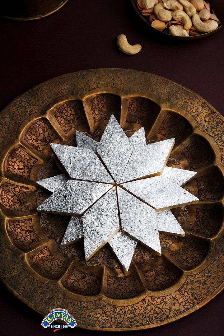 Kaju (Cashew) nut katri is a soft sweet. Prepared by standard kaju roll with pharma grade law sugar, and dressed with a vegetarian silvery coating(Varakh), 12 days shelf life.