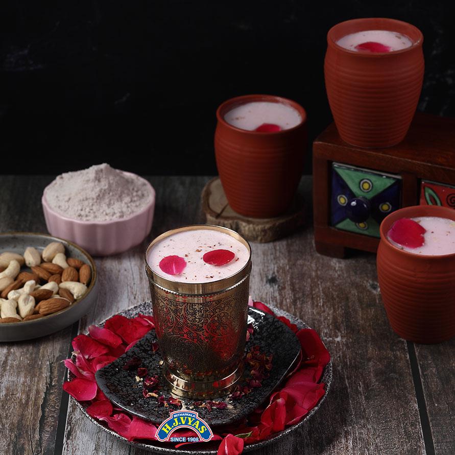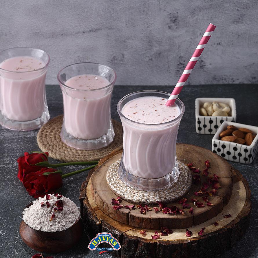Directions for Use: Add 1 Teaspoon of H.J. Vyas Mithaiwala's Rose powder to 100ml of cold milk, blend and mix it well, and refridgerate it. (Do not add extra sugar) serve chilled to enjoy.