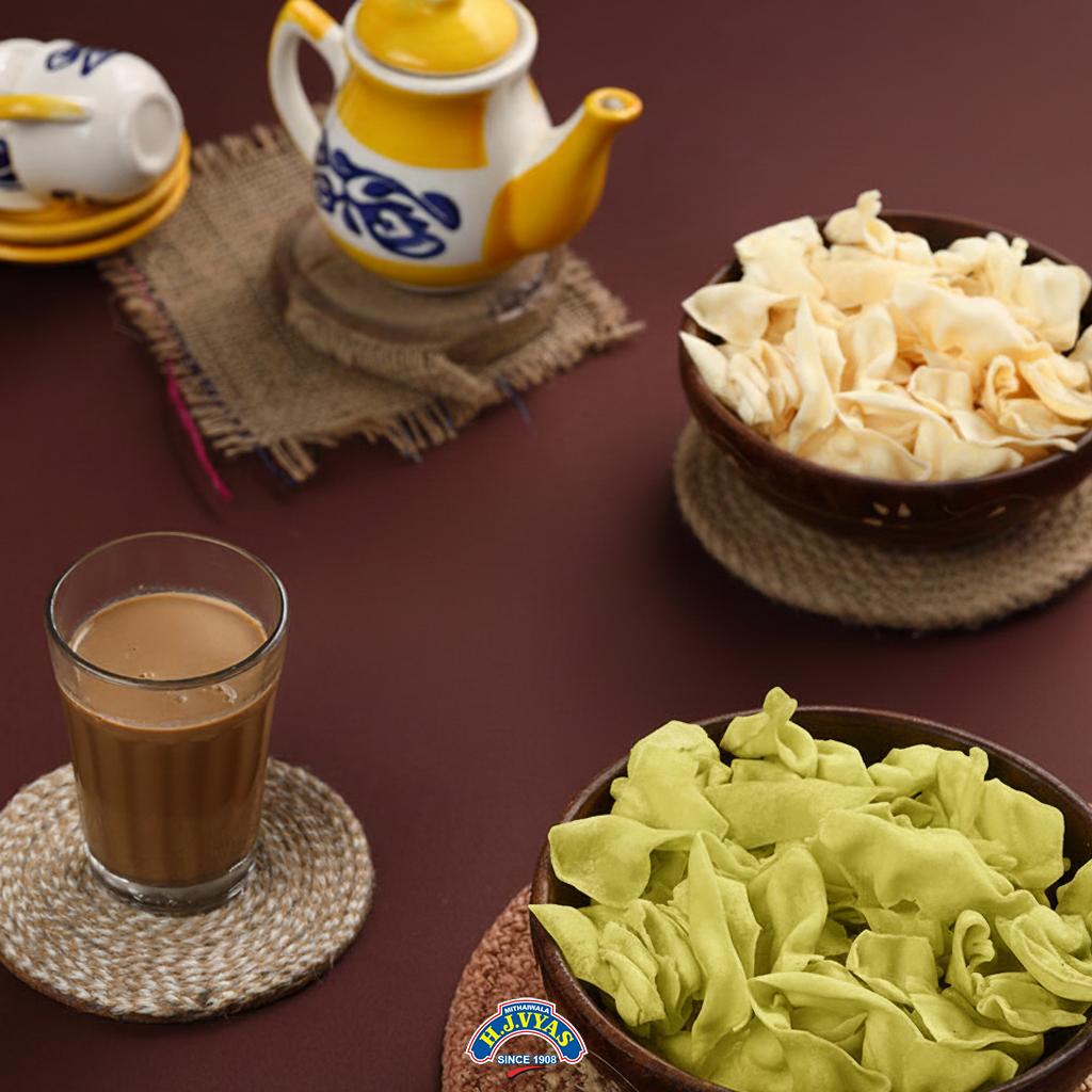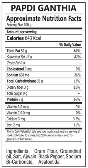 The thin, crunchy-munchy papdi ganthia! Minimum salt! Minimum soda! Made out of premium brand gram flour and fried in pure peanut oil. It's a great combo with tea at any time of the day. The freshness and taste remain for 45 days.